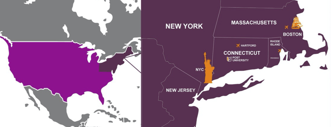 A Post University está localizada em Waterbury, Connecticut, a apenas 30 minutos de Nova York e a cerca de 2 horas de Boston. Esta proximidade com duas das mais importantes e dinâmicas cidades do mundo oferece aos estudantes inúmeras oportunidades culturais, profissionais e de lazer, sem sacrificar a tranquilidade e o foco proporcionados por um campus situado em uma área mais tranquila.